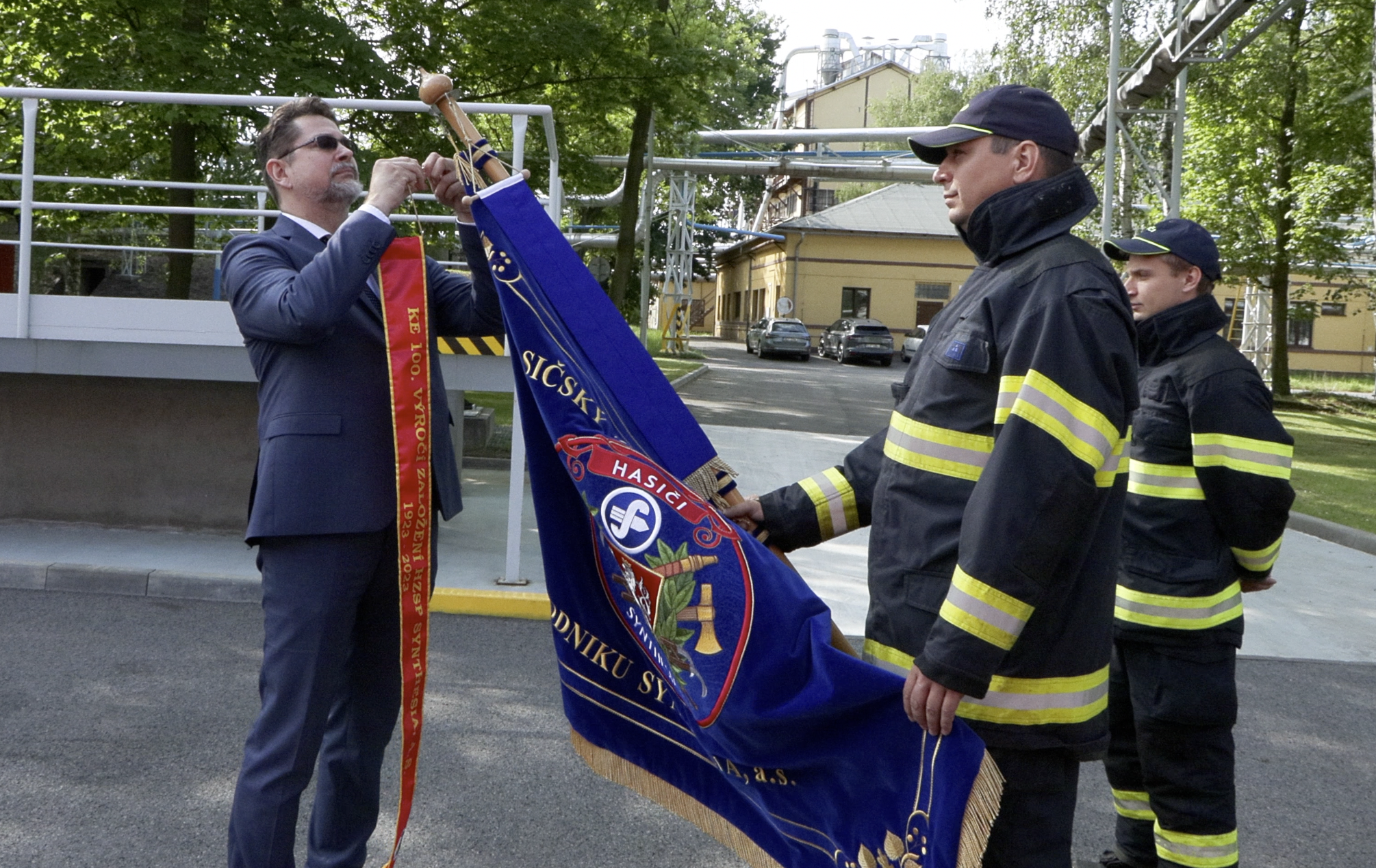 Podívejte se, jak proběhl slavnostní ceremoniál, kde generální ředitel společnosti Synthesia Ing. Josef Liška hasičskému sboru slavnostně předal stuhu ke 100letému výročí. Tu na prapor jednotky rovněž zavěsil Plk. Mgr. Aleš Černohorský, ředitel Hasičského sboru Pardubického kraje.