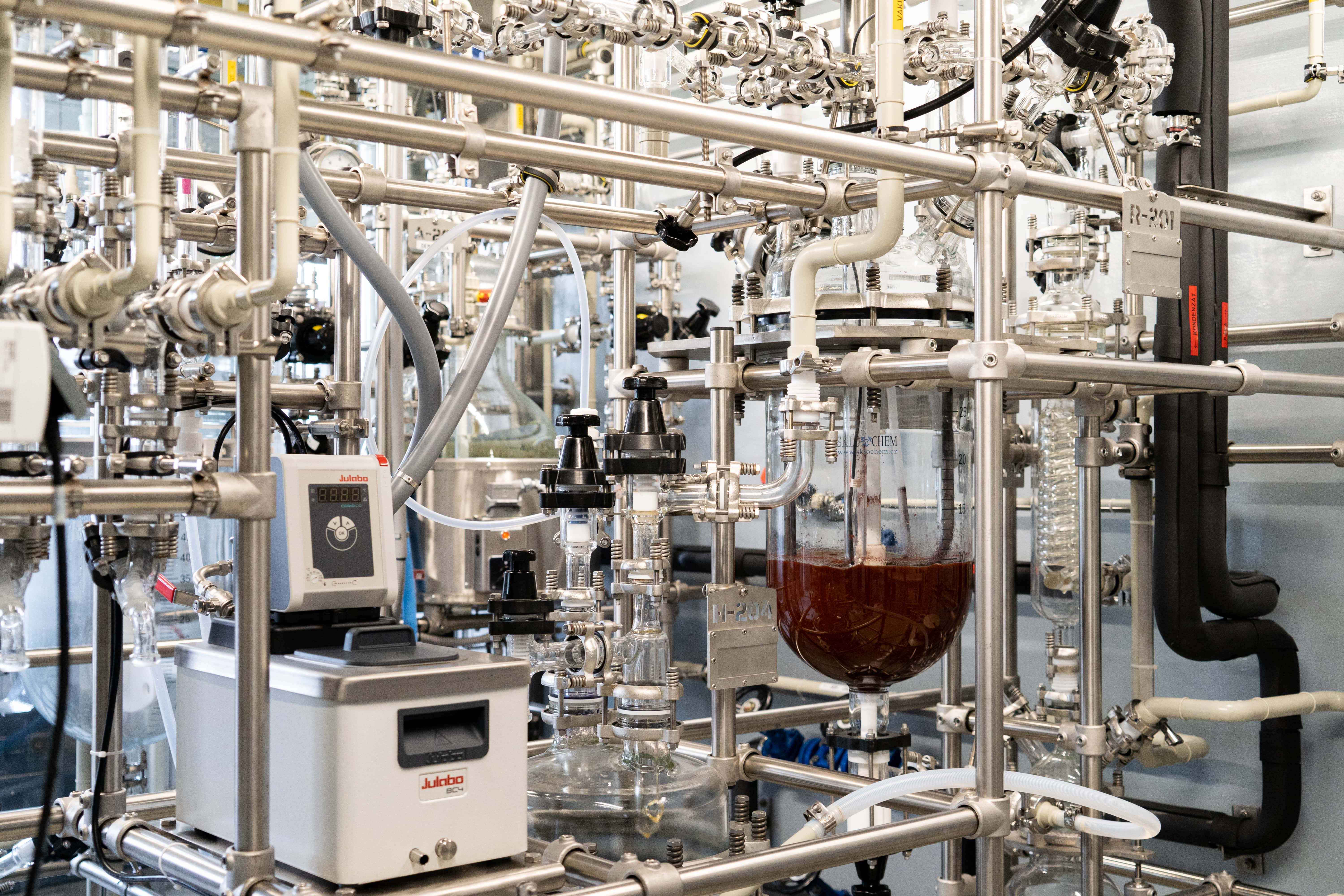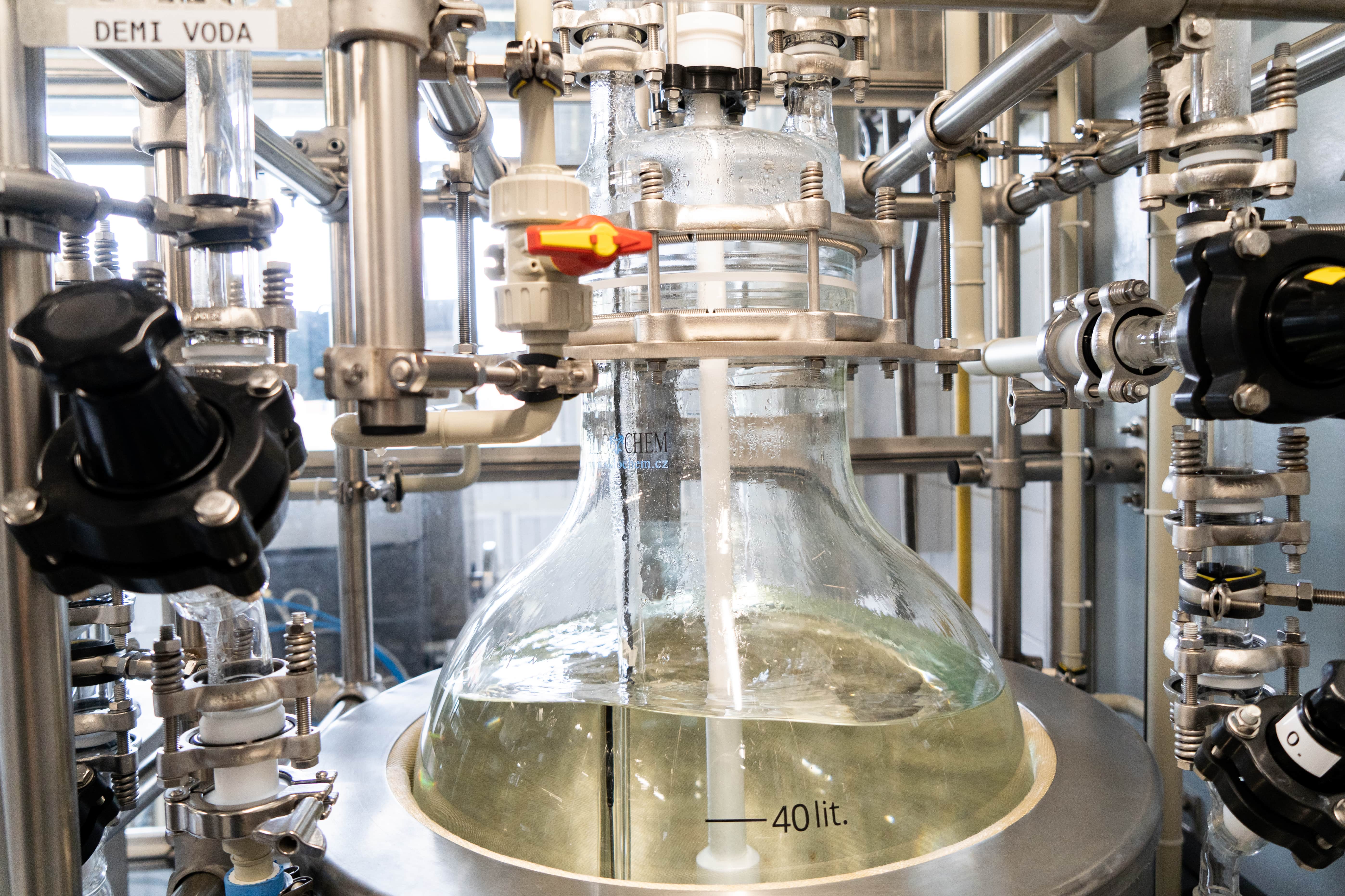 Hlavním důvodem celkové výměny skleněné aparatury byl stále častější problém sehnat k původnímu zařízení náhradní díly, protože téměř všechny byly vyrobeny a upraveny na zakázku. Nová aparatura umožní do budoucna plnit kvalitativní požadavky zákazníků a přísné legislativní nároky, které jsou na farmaceutické výrobny kladeny. Použité spojovací materiály, provedení spojů, měřidla nebo nové rozvody medií, míchadla v reakčních nádobách, všechno odpovídá současným technickým možnostem. Co však zůstalo stejné, je použití borosilikátového skla pro aparaturu. Také výrobní postup, který je registrován, musel zůstat beze změn.
